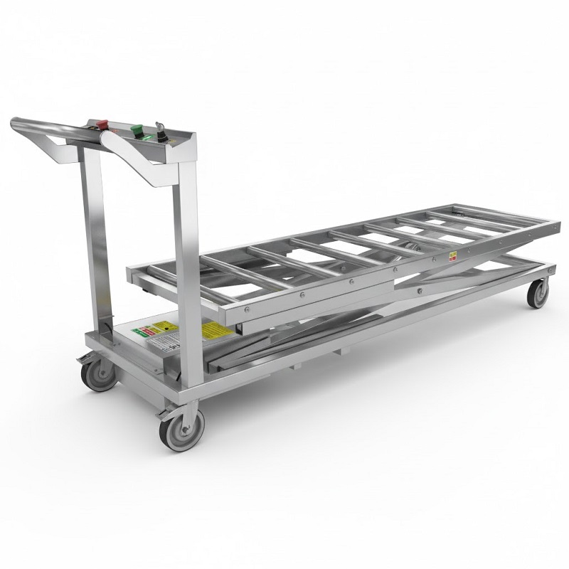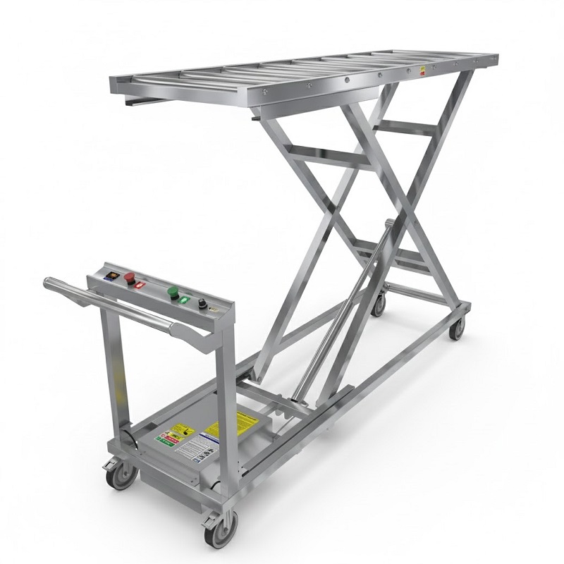 AISI 304 paslanmaz çelik gövdeli, şarjlı elektrikli cenaze kaldırma lifti. Morg ve gasilhanelerde güvenli, ergonomik ve hijyenik kullanım sunar.